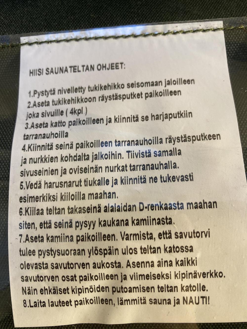 Savotta Hiisi saunateltta on erittäin yksinkertainen koota ja sen kokoaminen onnistuu yhdeltäkin henkilöltä.
