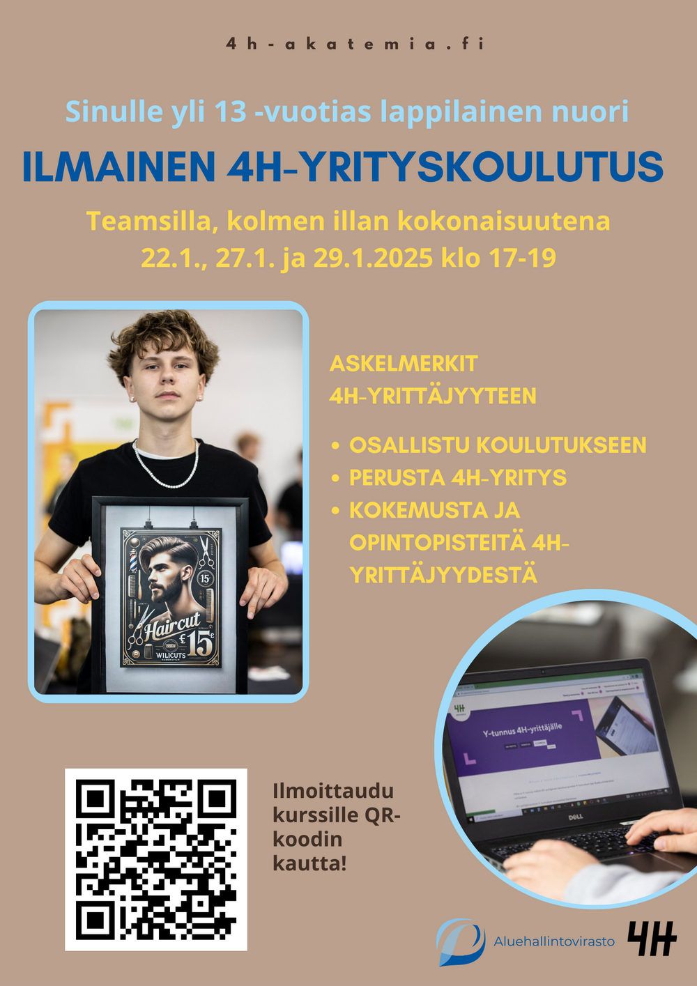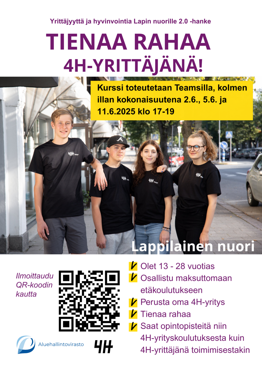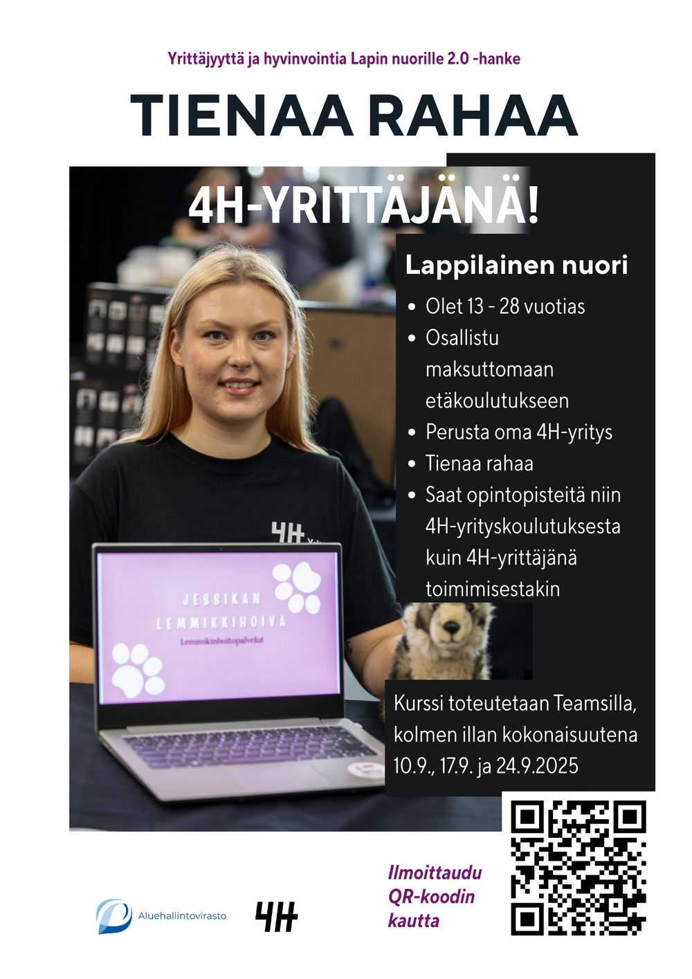 Yrittäjyyttä ja hyvinvointia Lapin nuorille -hanke tuottaa vuosien 2024 - 2025 aikana ilmaisia, kaikille lapin nuorille suunnattuja etäkoulutuksia noin kerran kuukaudessa.Koulutukset toteutetaan kolmen illan kokonaisuuksina Teams etäyhteydellä.