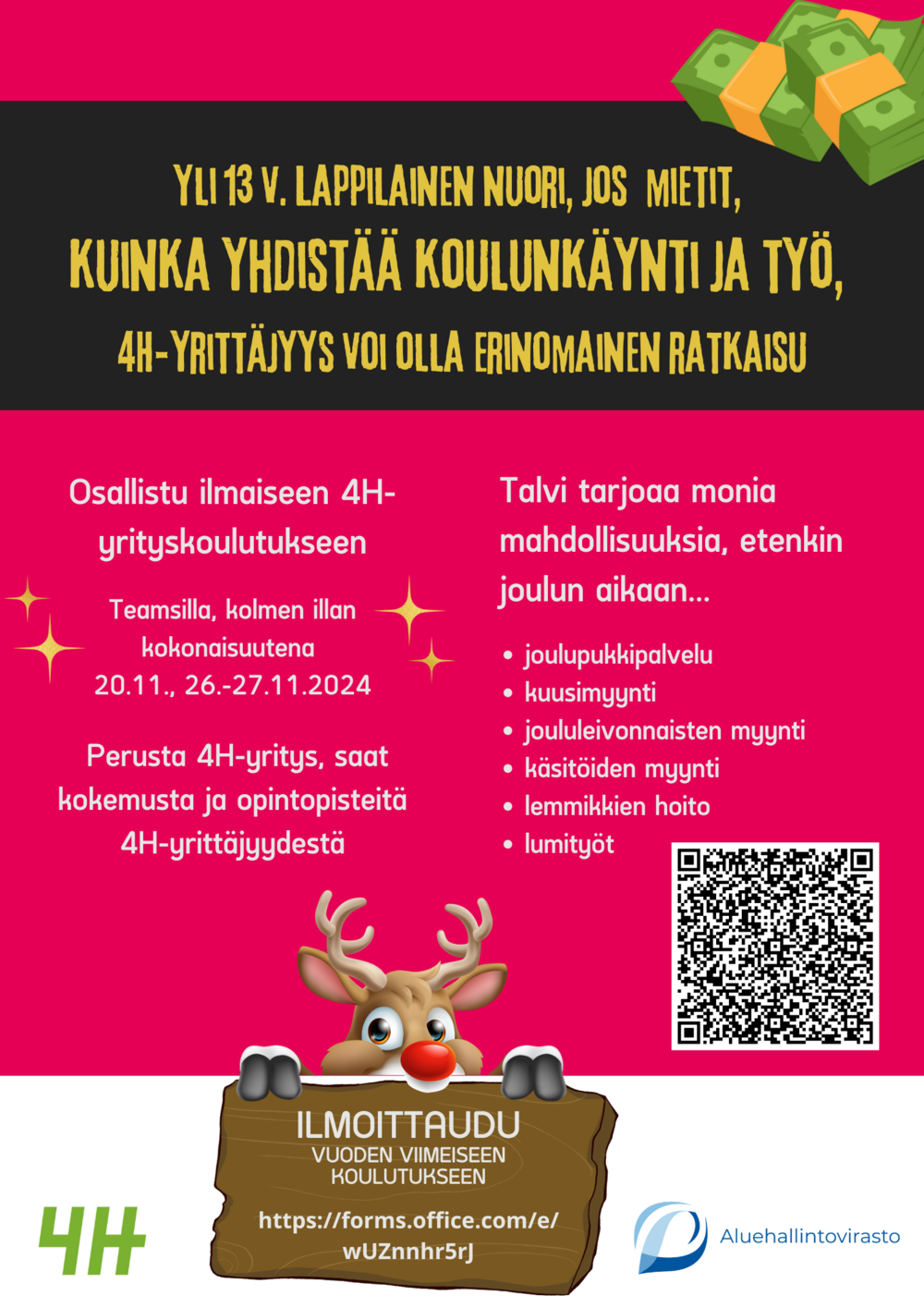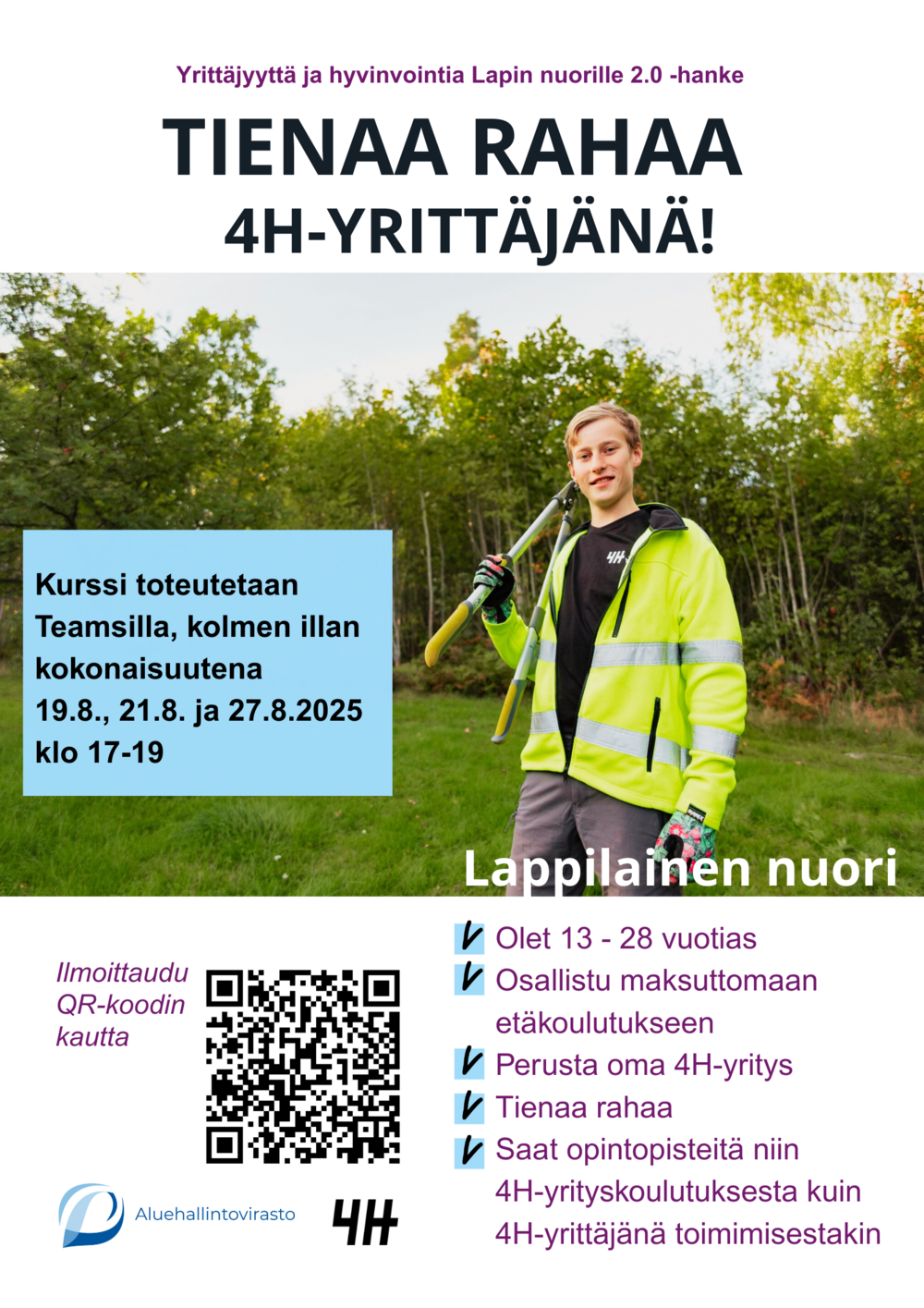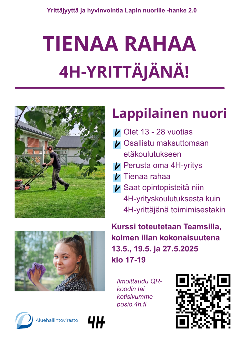 Yrittäjyyttä ja hyvinvointia Lapin nuorille -hanke tuottaa vuosien 2024 - 2025 aikana ilmaisia, kaikille lapin nuorille suunnattuja etäkoulutuksia noin kerran kuukaudessa.Koulutukset toteutetaan kolmen illan kokonaisuuksina Teams etäyhteydellä.