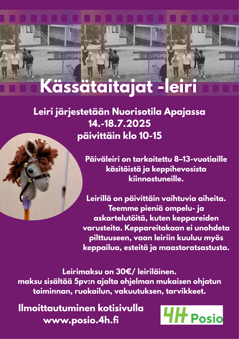 Posion 4H-yhdistys järjestää kaksi päiväleiriä kesällä 2025. Leirelle otetaan enintään 12 lasta per leiriviikko ja leirit toteutetaan, kun vähintään kuusi lasta on ilmoittautunut leiriviikolle.